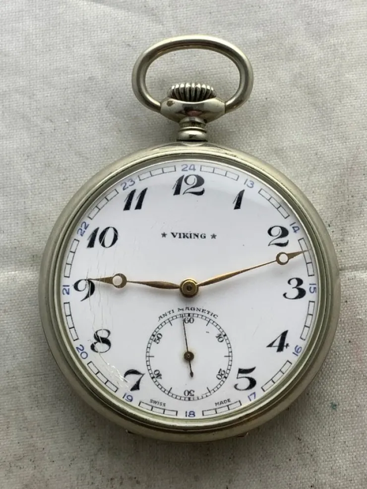 Uret virker, holder tiden ganske godt, urskiven er i fin stand, der er små revner i glasset, synlige på billedet, kassen er i god stand, ingen kant skader, diameter 5cm