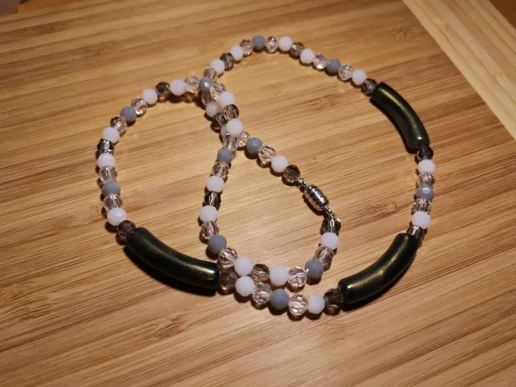 Ett fint halsband i vita, klara till grå fasett slipade, 6 mm glaspärlor samt 3 stycken ca 30 mm långa och 8 mm breda lätt böjde grå-gröna dekor pärlor.