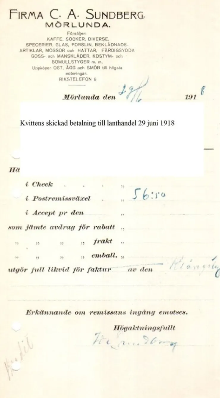 Tradera Firma CA Sundberg Mörlunda Kvittens på erlagd betalning 29 juni 1918 lanthandel> Fragtsedler & Fakturaer