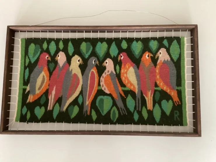 En väggbonad (flamskvävnad) med fåglar i en vacker design. Den är tillverkad i ull och har en fin struktur. Signerad R. Mycket gott skick, inget att anmärka på. Mått inklusive ram är ca: