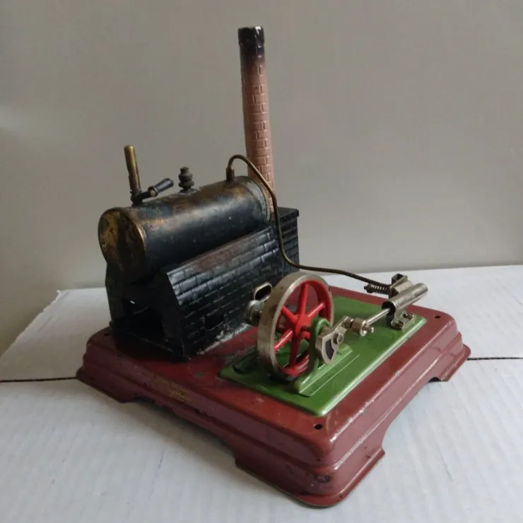 Säljer en ångmaskin i metall. Den är en vintage leksak och har en charmig retrodesign. Perfekt för samlare eller nostalgiker. Längd : 18 cm. Höjd: 18 cm Bredd 15 cm.