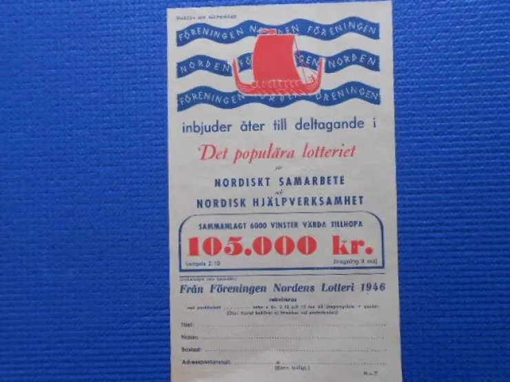 Reklamblad Föreningen Norden inbjuder till deltagande i 1946 års stora lotteri till förmån för Nordiskt samarbete och Nordisk hjälpverksamhet