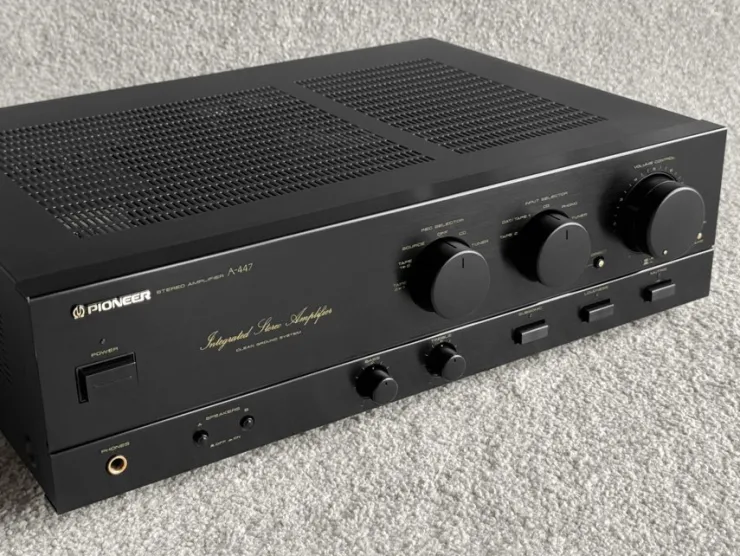 Pioneer A-447 integrerad stereoforstärkare. Tung förstärkare med mycket kraft! Flera ingångar, inklusive RIAA för Phono (både MM och MC), Tuner, CD, DAT/Tape 1 och Tape 2. Bas- och diskantreglage, loudnessfunktion, subsonicfilter och muting. Förstärkaren har utgångar för två högtalarpar (A och B) samt hörlursutgång. Jättefint skick, recappad för två år sedan. En ägare!