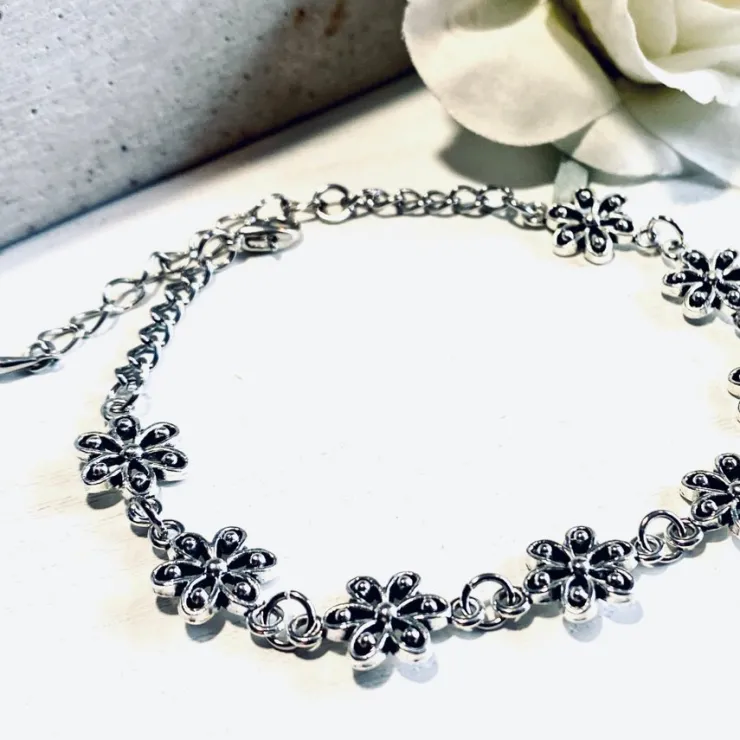 Fotlänk med blommor och kedja silverfärgade