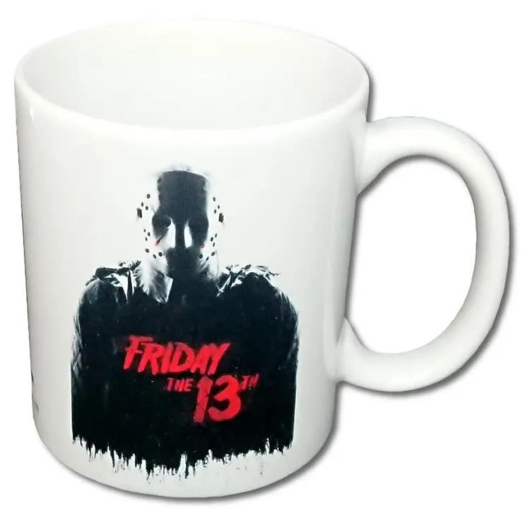 Vit mugg med Friday The 13th motiv.