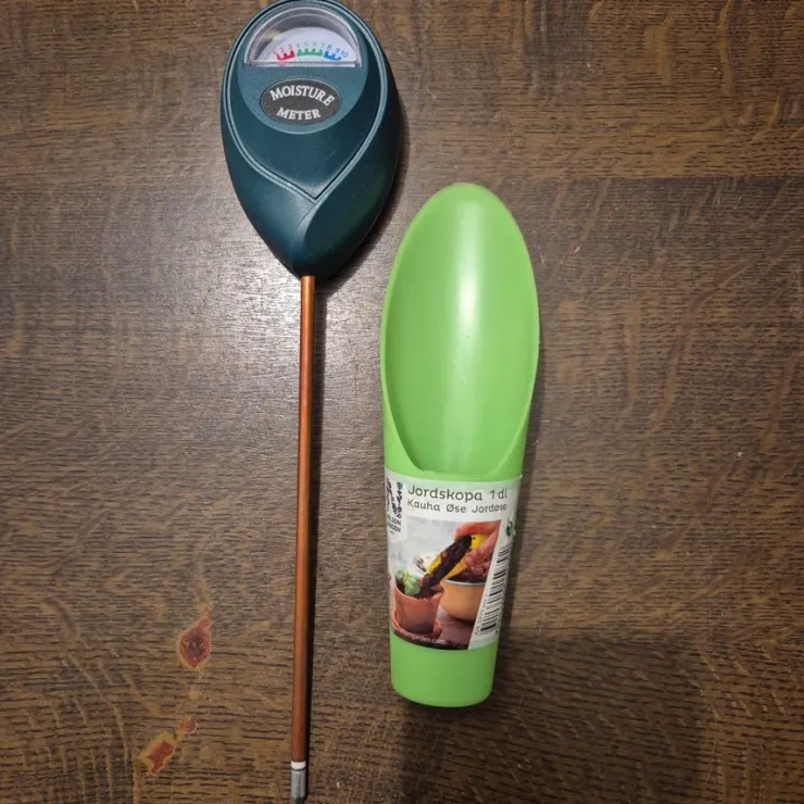 Säljer en fuktighetsmätare för krukväxter samt en liten skopa för jord. Perfekt för den som vill hålla koll på växtens vattenbehov.