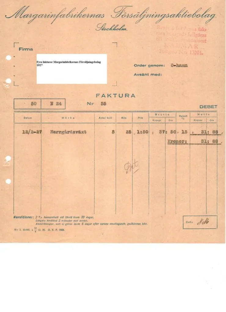 Tradera Fyra fakturor från Margarinfabrikernas Försäljningscentral från 1927> Fragtsedler & Fakturaer