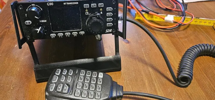 G-CORE G90 HF-transceiver med tillhörande handkontroll. 20 watt ut. Enheten är utrustad med flera funktioner och anslutningar. Bilderna visar enheten från olika vinklar och detaljer. Strömförsörjning med 12 volts plugg.