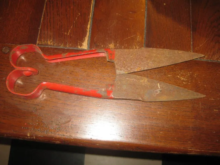 Gamla sekatör 29,5 cm med röda handtag. Perfekta för den som letar efter vintage trädgårdsredskap eller samlarobjekt.