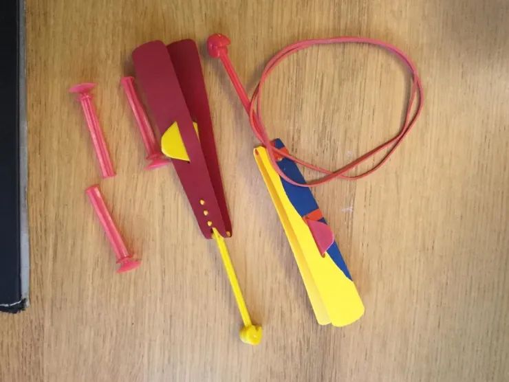 Gammal leksak "pilkakastare" ? i plast och papper
