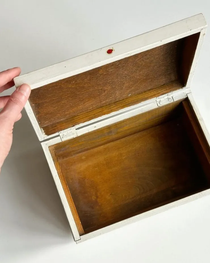 Trækasse med låg, og sirligt udklippede blomster til decoupage. God plads og smuk patina.