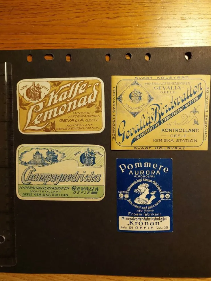 Gävle, Gefle, Gevalia, Kronan. Kaffelemonad, bordsvatten, champagnedricka, pommere. Etiketter