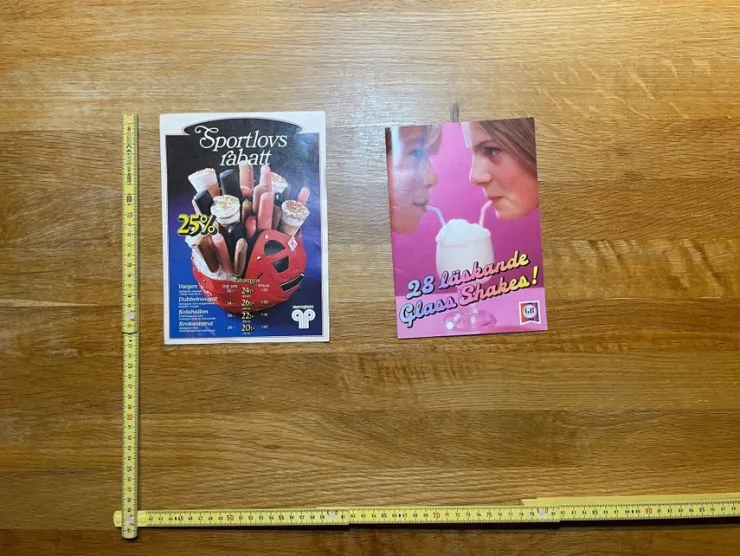Samling reklam från 80- talet, med fokus på glass och sportlovsrabatter. Broschyrerna visar olika glassorter, shakes och sportlovs-erbjudanden. Perfekt för nostalgiker eller samlare av retroreklam.