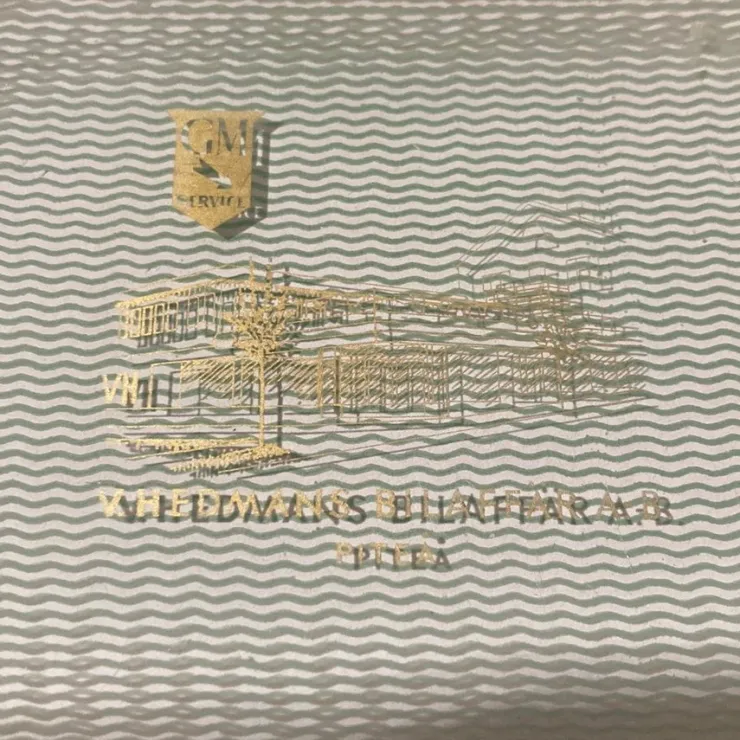 Glasaskkopp med tryck av V. Hedmans Bilaffär. har en vågmönstrad bakgrund och är dekorerad med en bild av affären samt GM Service-logotyp.