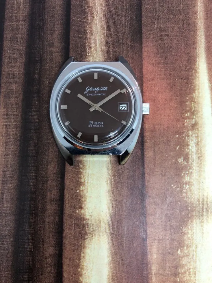 Fin urskive, billede 3 viser farven bedst. De prikker, der ses, er i glasset. Glasset er lidt ridset, og en større ridse, der ikke er dyb, kan sikkert let poleres væk.