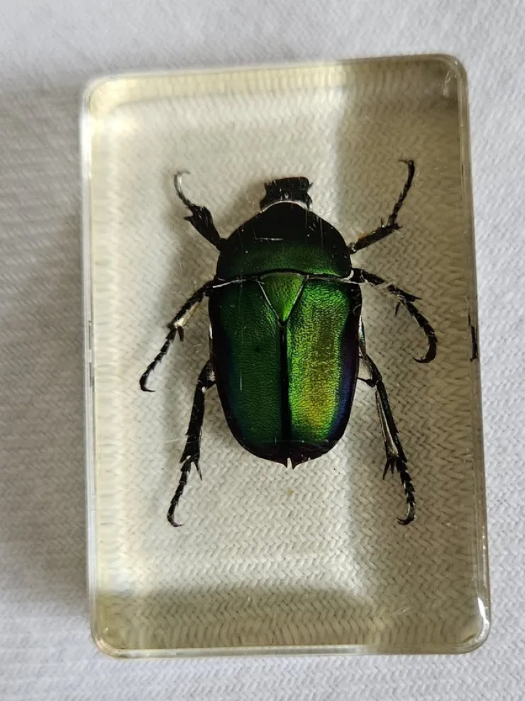 Tradera Gräsgrön guldbagge ingjuten i plast.> Kuriositeter