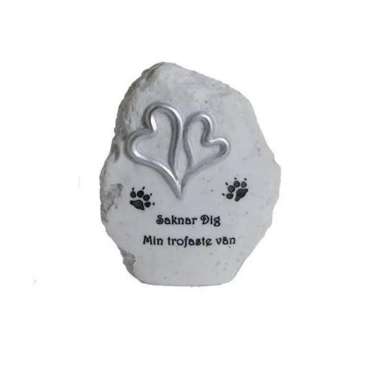 Formad som en sten med hjärtan, tassavtryck och texten "Saknar dig min trofaste vän"
