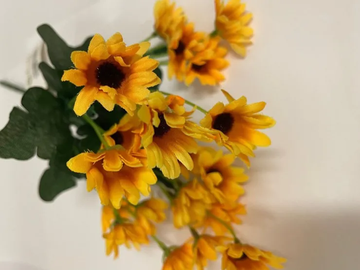Gula konstgjorda blommormed gröna blad. Perfekt för att skapa en vacker och levande atmosfär i ditt hem.