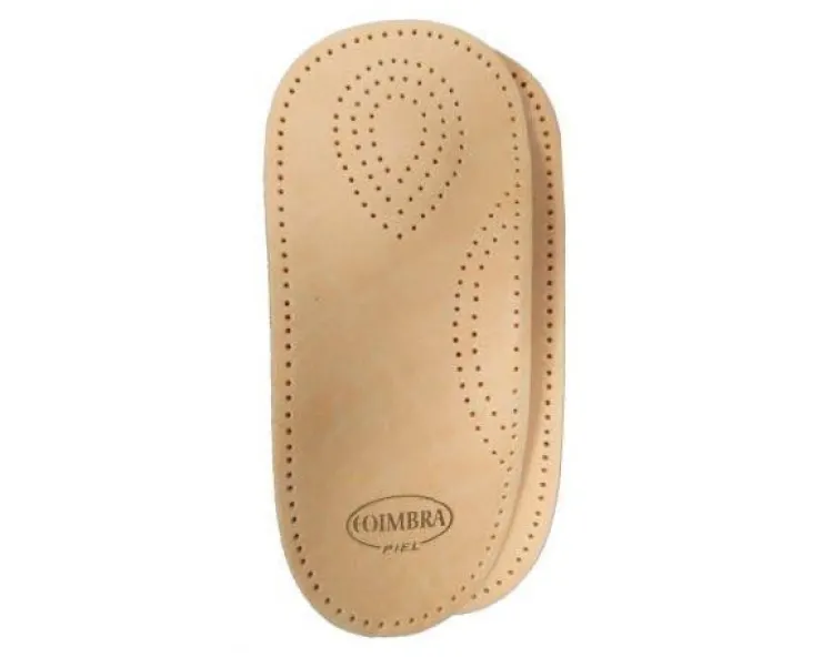 Halv hålfotsinlägg av kalvskinn, garvad med vegetabiliska material, 100 % ekologisk. Den anatomiska stöd för denna innersula hjälper till för en ordentlig vikt för fötterna, där stöd för hålfoten och häl dämpar stegen för att undvika trötthet och irritation i problematisk sporre.