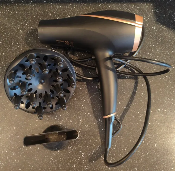 Hårfön med tillhörande munstycken. Perfekt för styling.