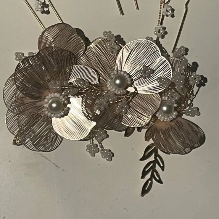 Snyggt hårsmycke i guld med blommor och pärlor. Perfekt för bröllop, fest eller andra speciella tillfällen.