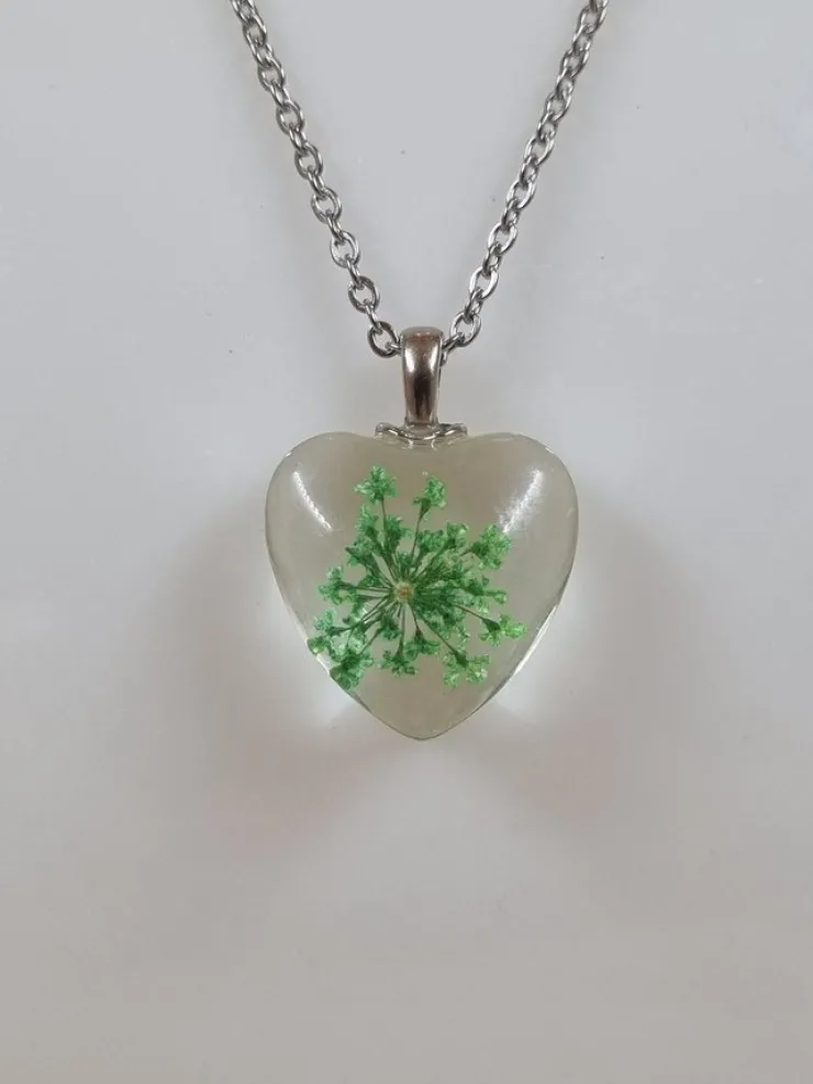 Fint, stilrent och simpelt halsband i rostfritt stål med tillhörande berlock (torkad blomma) i glas, formad som ett hjärta. Det kan finnas någon luftbubbla kvar i glaset, tänk på det innan köp och granska bilderna. Om du scrollar ner på sidan så ser du att det finns massor av andra halsband med fina berlocker – Flera olika storlekar, färger och former!