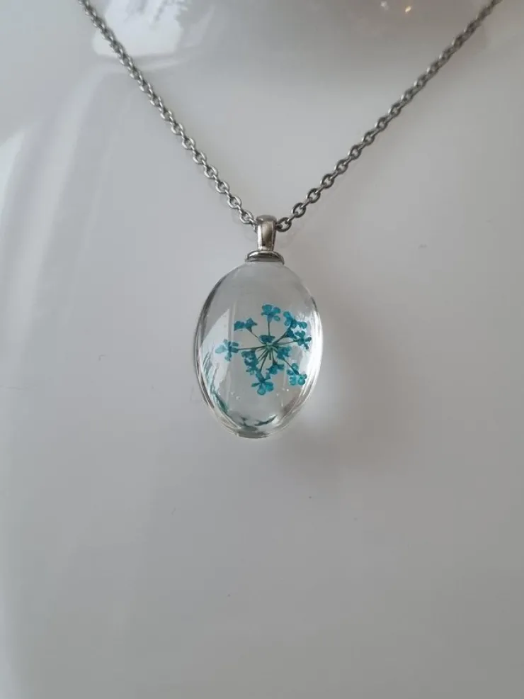 Fin, stilrent och simpelt halsband i rostfritt stål med tillhörande oval berlock (torkad blomma) i glas. Det kan finnas någon luftbubbla kvar i glaset, tänk på det innan köp och granska bilderna.