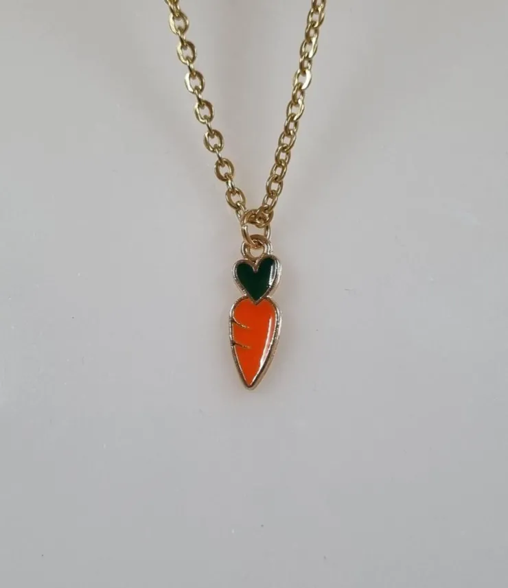 Fint och stilrent halsband i rostfritt stål med en berlock som föreställer en liten morot Finns flera olika storlekar på halsbanden, fler färger, former och motiv på berlockerna i butiken.