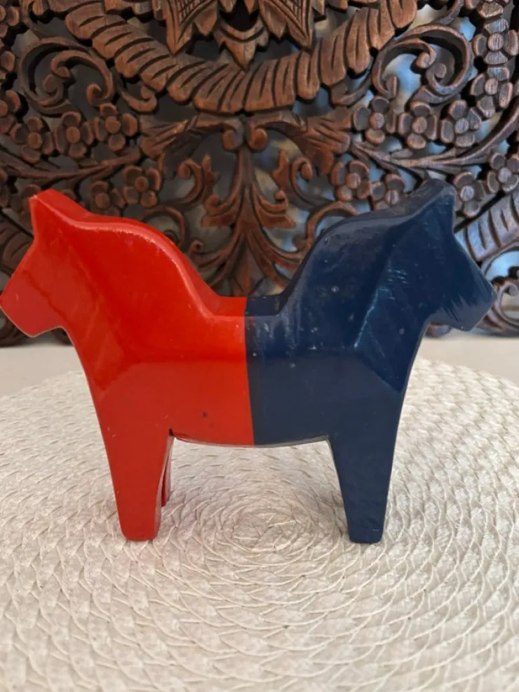 Tradera Halv röd, halv blå Dalahäst från Nils Olsson i Nusnäs| Dalarheste