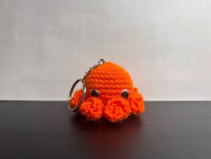 Säljer denna charmiga handgjorda nyckelring i form av en orange bläckfisk. Den är virkad med omsorg och detaljerad med små söta ögon. Perfekt som en unik accessoar till dina nycklar eller som en fin present till någon du tycker om.