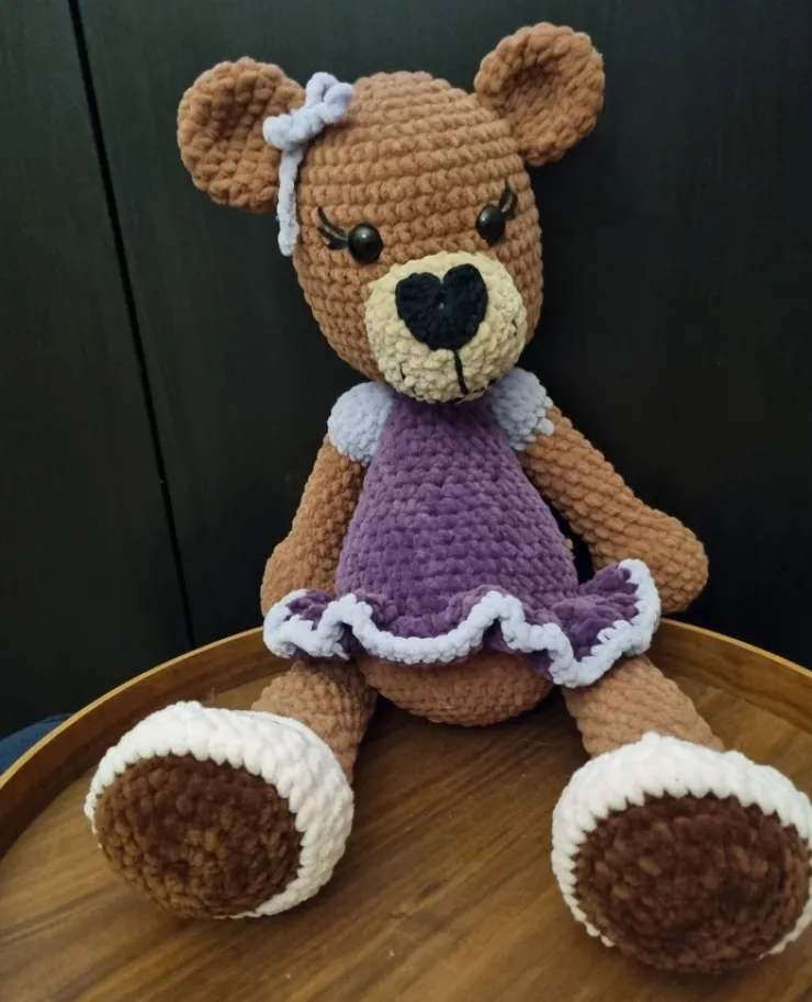 Söt och kramig handgjord virkad nallebjörn i brun och lila. Björnen bär en söt lila klänning med volang. Perfekt present till ett barn eller samlare av handgjorda leksaker. Tillverkad med mjukt garn.