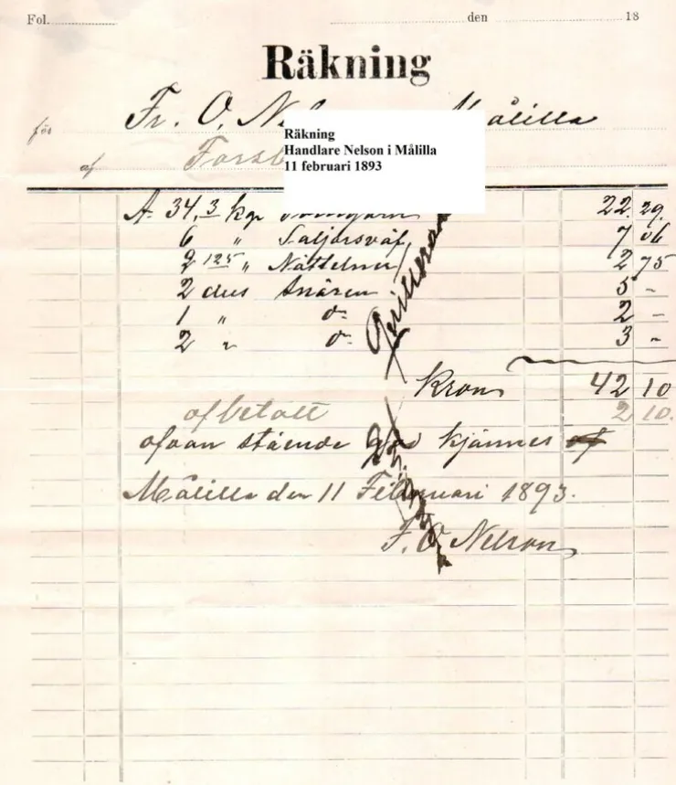 Tradera Handlare Fr. O. Nelson Målilla – Räkning daterad den 11 februari 1893> Fragtsedler & Fakturaer