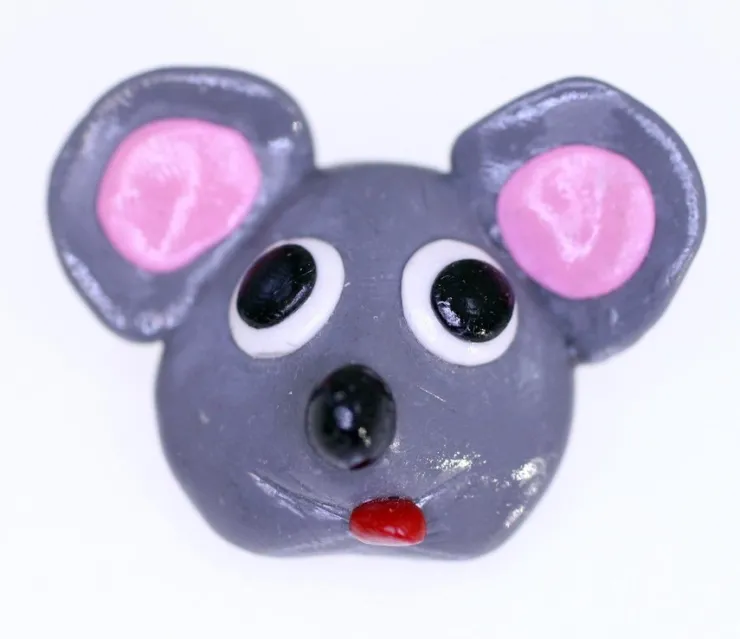 Handmade of plastic putty in the shape of a mouse's head the brooch has a pin on the rear for fastening