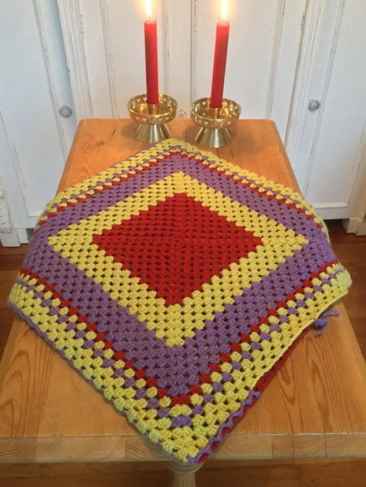 Här bjuder du på ett jättefint handvirkat kuddfodral i rött, lila & limegrönt!