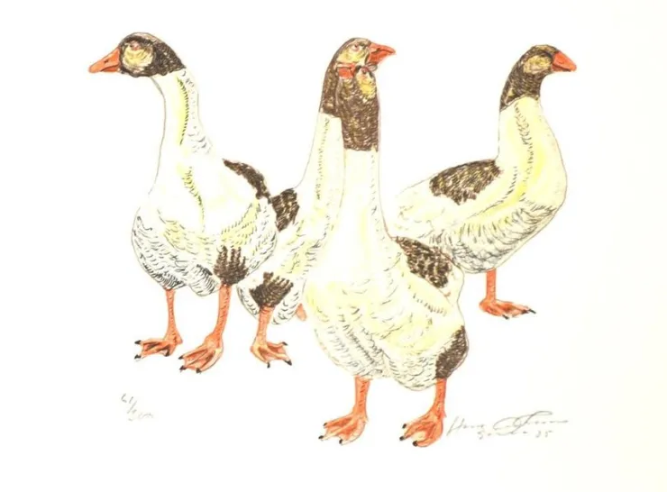 År 2003 gick Hasse Andersson ur tiden, men hans minne lever kvar genom en hel flock avporträtterade gäss, på såväl duk som grafikpapper (Källa: Broder Grå Konst & Antik).