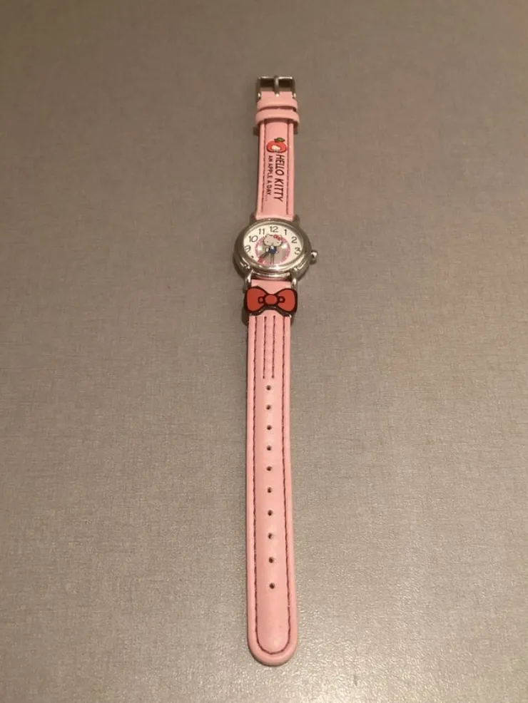 Sød Hello Kitty ur med lyserød læderrem. Uret er i god stand og har et fint Hello Kitty-motiv på urskiven. Remmen er lyserød og har Hello Kitty-logoen præget på. Uret drives af et kvartsurværk. Perfekt gave eller til Hello Kitty-elskeren!