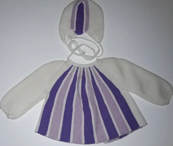 Ny och oanvänd hemstickad tröja i garn för bebis, i vitt med ljust och mörkt lila lodräta ränder. Knäppning med vita knappar. Mössa med snörning ingår.