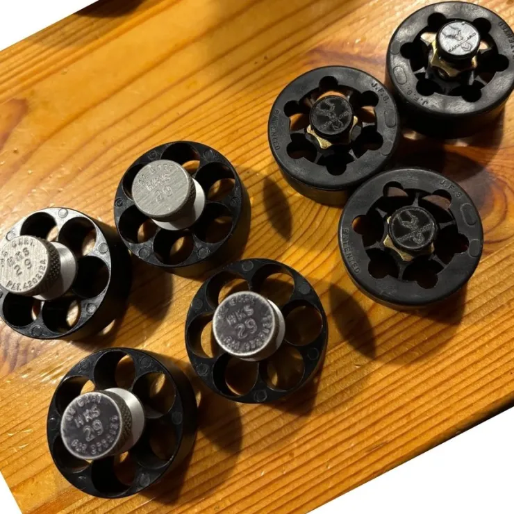 Sju stycken snabbladdare till Smith & Wesson M29 N-stomme. 4st HKS snabbladdare och 3st Safariland.