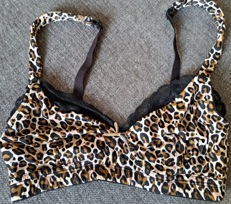 En amningsbh i leopardmönster med spetsdetaljer. Kom aldrig till användning, endast tvättad.