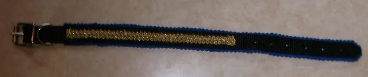 Hundhalsband i mjuk och skön mörkblå fleece påsytt på svart kraftigt band med guldmönster.