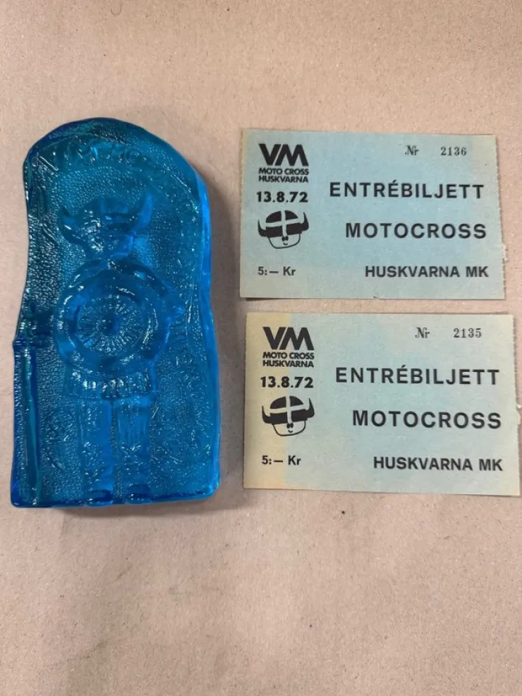 Husqvarna viking minnes glas prydnad med motiv från Husqvarna VM i Motocross 1972. Medföljer två entrébiljetter från evenemanget. Tävlingen gick på Drättinge banan i Husqvarna