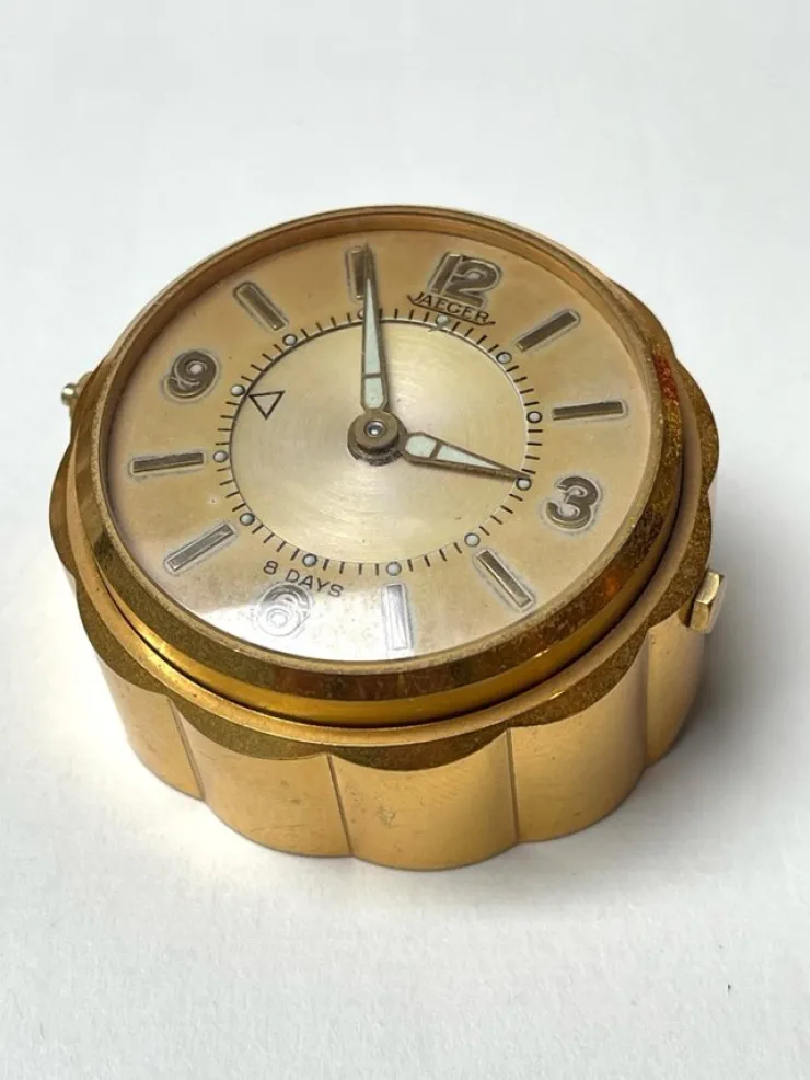 Snyggt JAEGER 8-dagars bordsur i guld. Urverket är mekaniskt. Visaren är i bra skick. Klockan är i begagnat skick och har vissa tecken på användning, se bilder. Observera att det inte finns någon information om urverkets kaliber.
