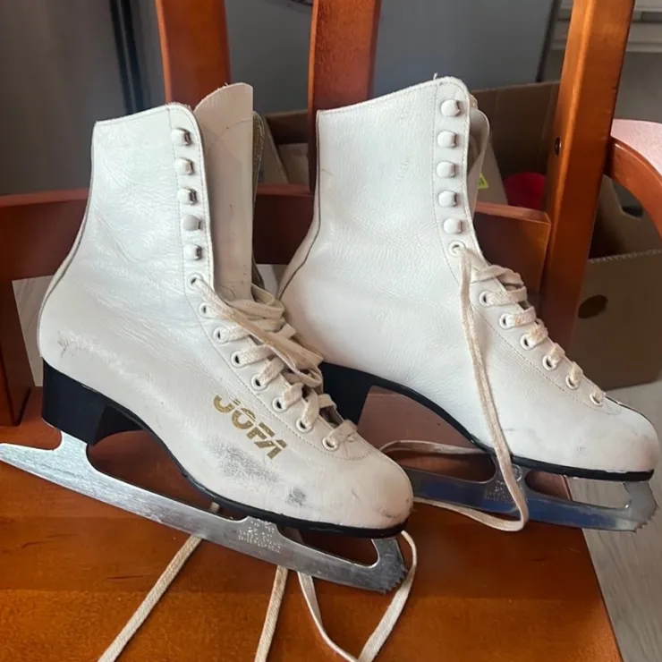 Vita konståknings skridskor från Jofa storlek 38. Skridskorna är i bra skick och redo för att användas.