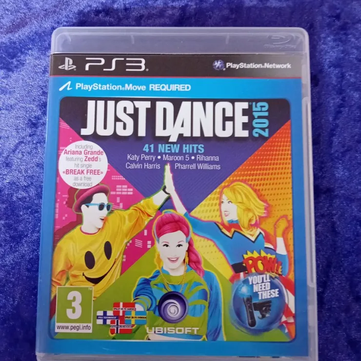Just Dance 2015 til Playstation 3. Spillet inkluderer 41 nye sange fra populære kunstnere som Ariana Grande, Katy Perry, Maroon 5 og Rihanna. PlayStation Move kræves for at spille.