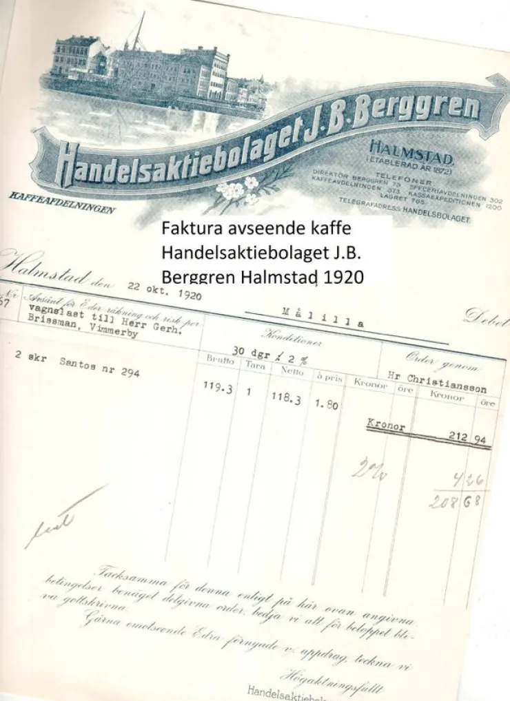 Till försäljning här finns en faktura från Handelsbolaget J.B. Berggren i Halmstad som är daterad den 22 oktober 1920 och utställd till en småländsk lanthandel. Den kommer från bolagets Kaffeafdelning och avser en leverans av 2 skr Santos nr 294. Den har förvarats i den sedan mycket länge nedlagda lanthandeln sedan 1920! Är i ganska gott skick med en del veck och åldersförändringar som kan förväntas av ett papper som är drygt 120 år gammalt.