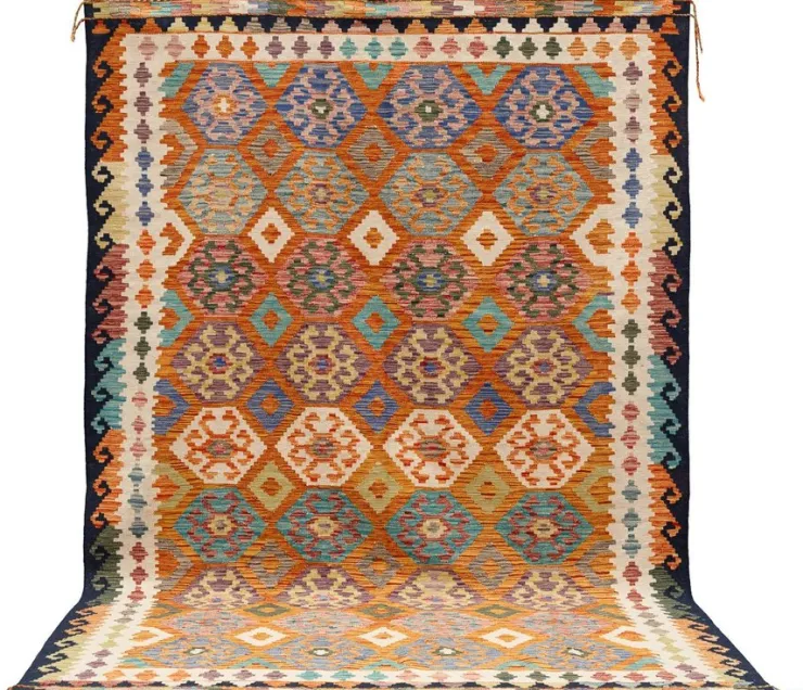 Handvävd klassisk Kilim matta i fina färger och mönster, ca 302×200 cm.
