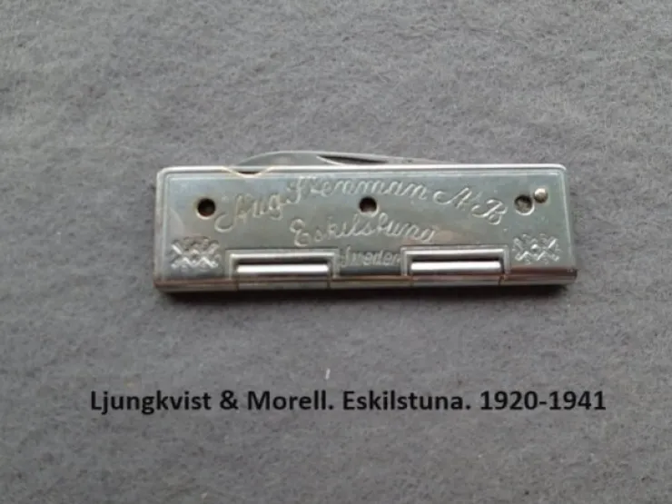 En fickkniv tillverkad av företaget Ljungkvist & Morell i Eskilstuna som reklam åt företaget August Stenman AB i Eskilstuna. Skaft av förnicklat stål. Ljunggkvist & Morell var verksamt mellan åren 1920-1941. Hopfälld så mäter den 77 mm. Den är i fint skick.