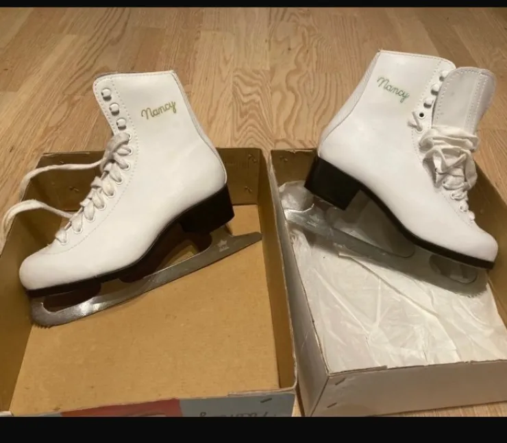Vita konståkningsskridskor från märket Nancy. Skridskorna är i storlek 34. De kommer i originalkartong.