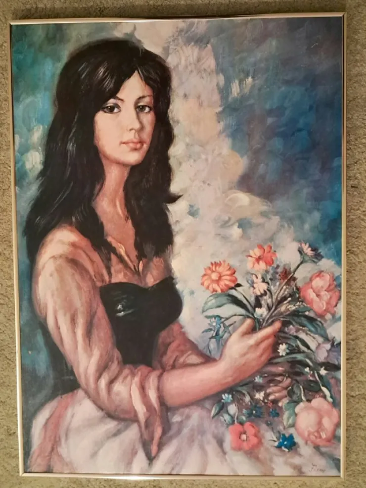 Vacker oljemålning föreställande en tjej med en bukett blommor. Målningen är utförd i varma färger och har en romantisk känsla.