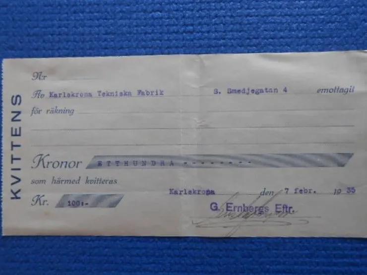 Tradera Kvittens av Karlskrona Tekniska Fabrik till G Ernbergs Eftr Karlskrona 1935> Fragtsedler & Fakturaer